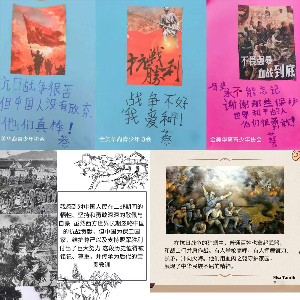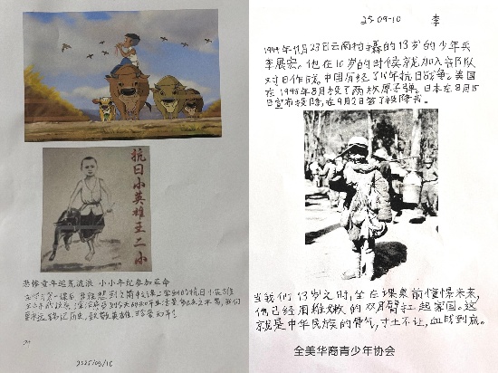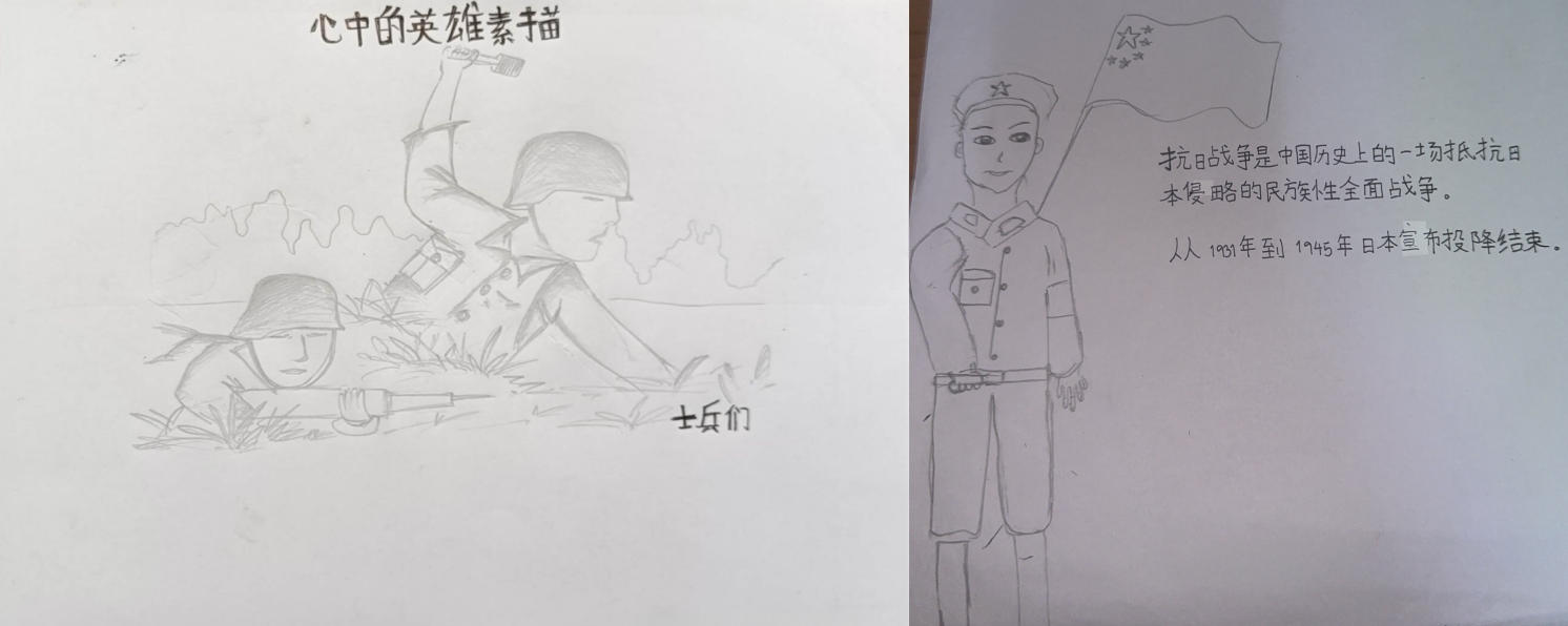 《中國貢獻》一課分為“中國,被遺忘的盟友”“中共,中國抗戰的中流砥柱”“中華兒女,浴血山河的勝利碑銘”三個小節,幫助海外華裔青少年了解中國對世界反法西斯戰爭的歷史貢獻,理解中國共產黨在抗戰中的中流砥柱作用,樹立正確二戰史觀。課后,海外華裔青少年們創作提交了豐富多彩的作品,通過文字、圖畫、海報等多種形式,生動記錄學習心得,將歷史認知轉化為情感認同。