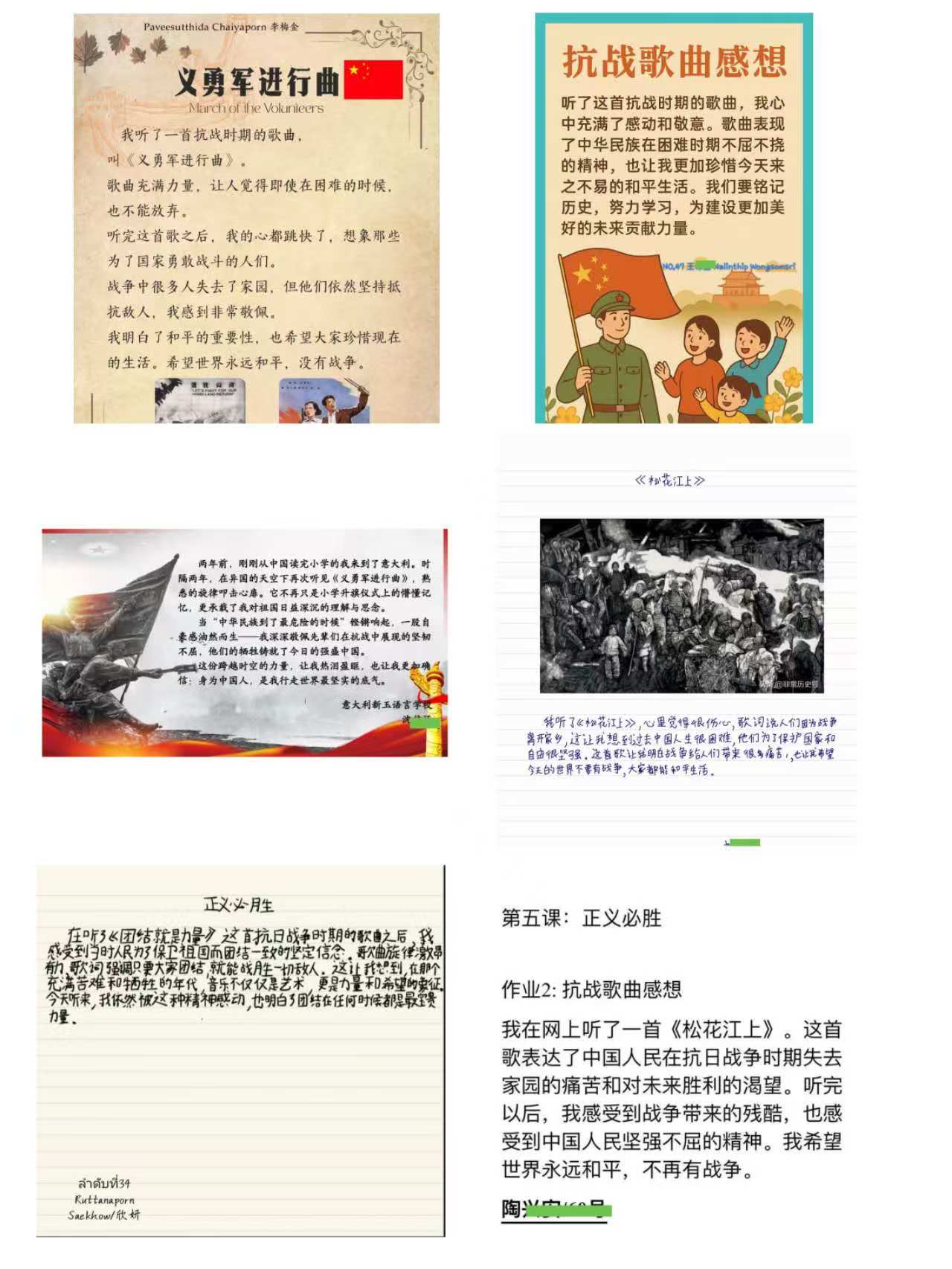 課后,營(yíng)員們還自發(fā)重溫或?qū)W唱《義勇軍進(jìn)行曲》《保衛(wèi)黃河》《團(tuán)結(jié)就是力量》《松花江上》等抗戰(zhàn)歌曲,并創(chuàng)作提交了豐富多彩的作品,用文字、語(yǔ)言、視頻等描繪和平、唱響未來(lái)。