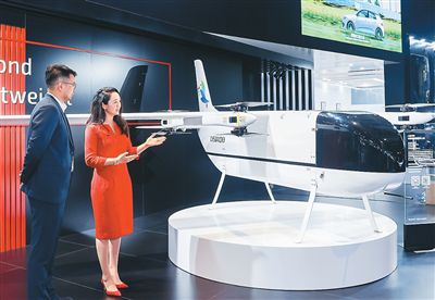 圖為在第八屆進博會上,亨睿碳纖維市場總監(jiān)陳文瑾(右)向觀眾介紹中型電動垂直起降物流無人機 LEU100真機。