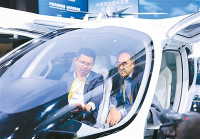 圖為在第八屆進博會上,黃雍威(左)在E20 eVTOL全尺寸真機內(nèi)為觀眾作講解。