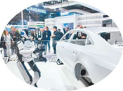 第八屆進博會技術裝備展區(qū),海克斯康集團展位上,AEON工業(yè)人形機器人手持海克斯康Leica掃描頭對白車身進行掃描。