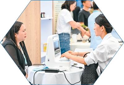 一名參觀(guān)者(右)在第七屆中國(guó)—阿拉伯國(guó)家博覽會(huì)現(xiàn)場(chǎng)體驗(yàn)中醫(yī)經(jīng)絡(luò)檢測(cè)儀。