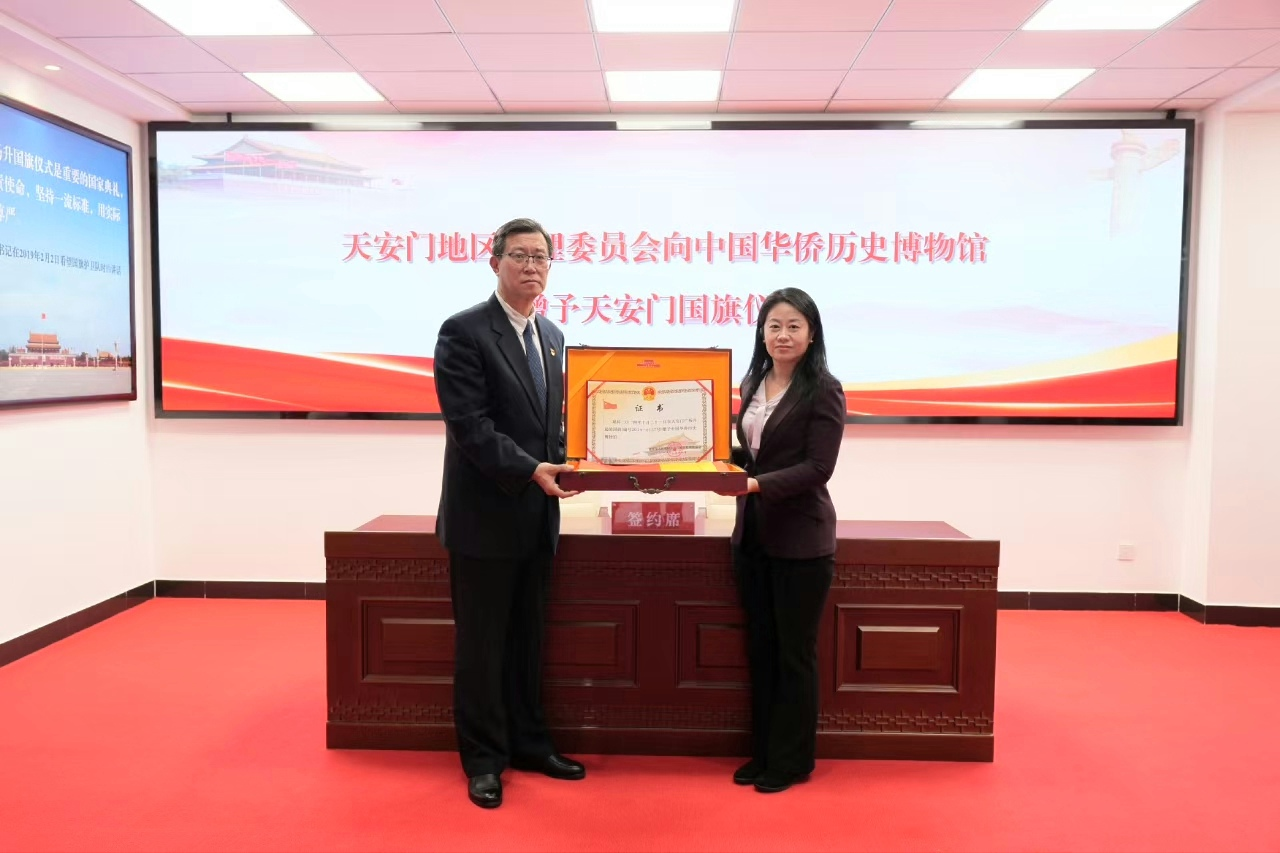 2025年11月28日下午,北京市人民政府天安門地區管理委員會在天安門國旗教育館舉行莊嚴儀式,向中國華僑歷史博物館贈予2014年10月21日在天安門廣場升起的中華人民共和國國旗。副館長雷霆代表僑博出席儀式并接受贈旗。